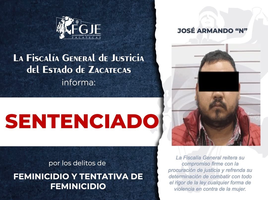 La Unidad de Homicidios Dolosos de la Vicefiscalía Distrital de Fresnillo, obtuvo sentencia condenatoria mediante procedimiento abreviado, en contra de José Armando “N”, por los delitos de feminicidio y tentativa de feminicidio, consistente en 40 años de prisión ordinaria y multa.